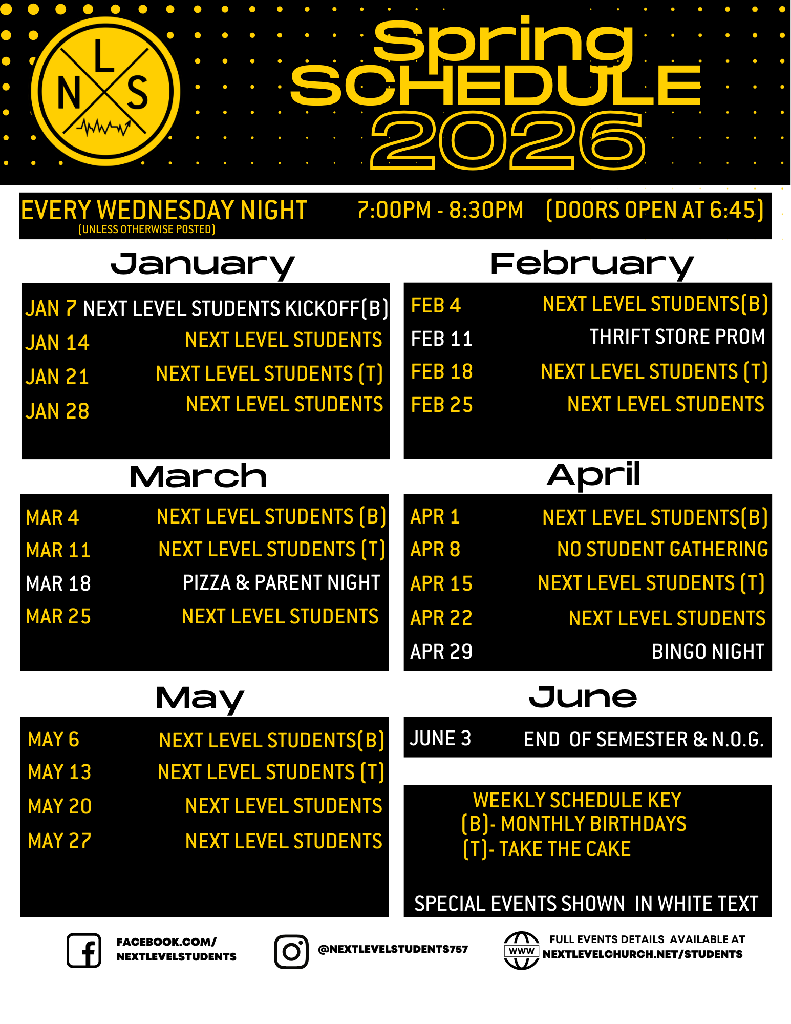 At Next Level Students we are passionate about leading students to love Jesus, love people, and make a difference! We believe that students are not simply the future of the church, but they are the Church now! That is why we not only encourage students to worship and serve with the rest of the church, but also create experiences that are designed specifically for middle and high school students (6th-12th Grade).